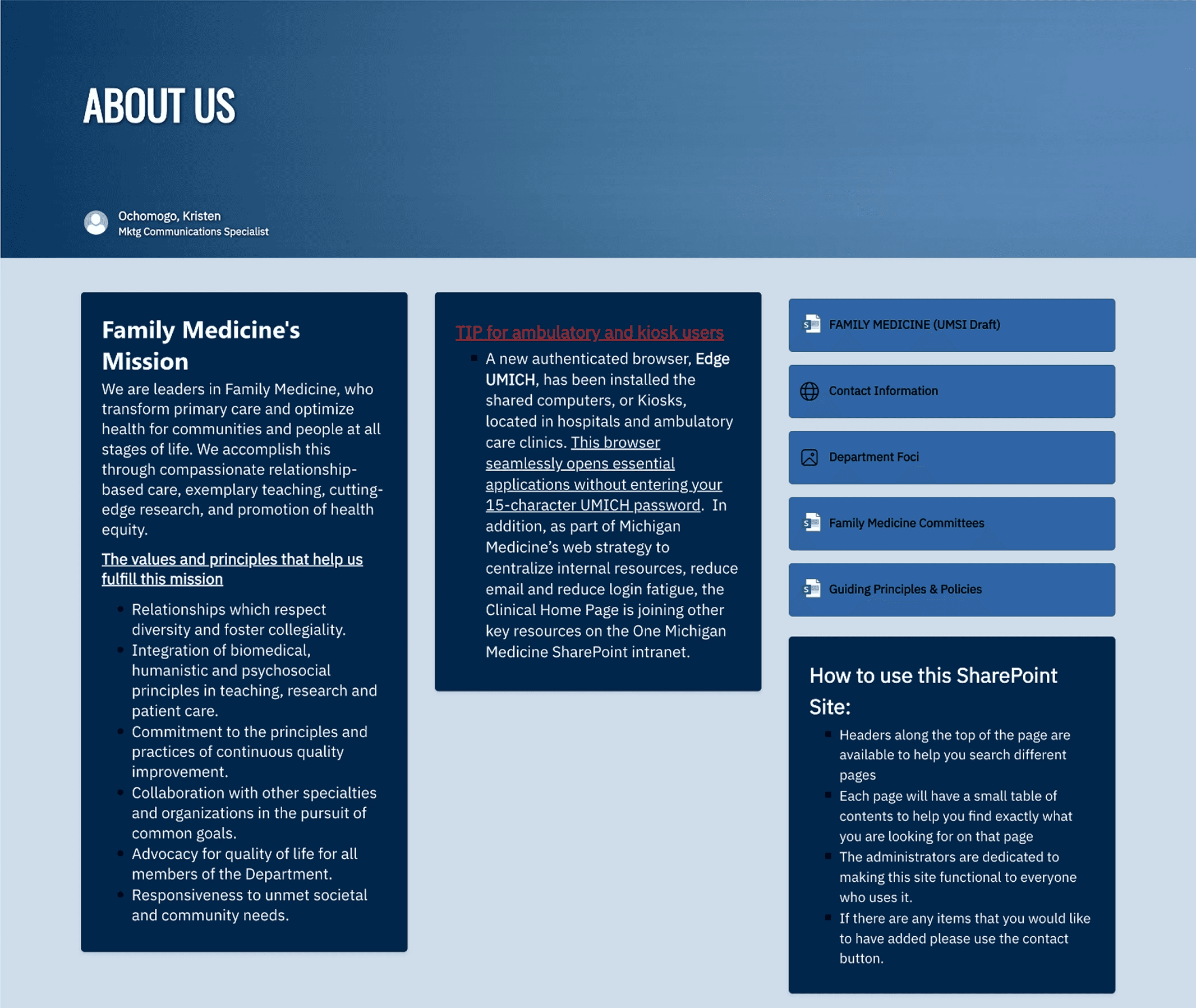 Orchestrating the migration of Michigan Medicine's fragmented, Legacy system into a single, user-centered department intranet.